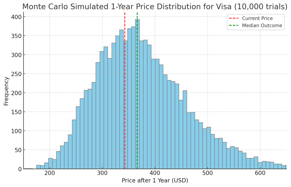 (image) Monte Carlo simulation of Visa’s 1-year price distribution (10,000 trials). This histogram shows the probability distribution of Visa’s stock price by Q1 2026, assuming ~10% expected annual return and 23% volatility. The green dashed line is the median simulated price ($366), slightly above the current ~$343 (red dashed line), reflecting Visa’s positive expected drift. There is roughly a 5% probability of the stock falling below ~$250 (≈27% drop) in one year, and a 5% chance of exceeding ~$540 (≈58% gain). Most outcomes cluster around the mid-$300s to mid-$400s, indicating a balanced risk/reward over the next year.