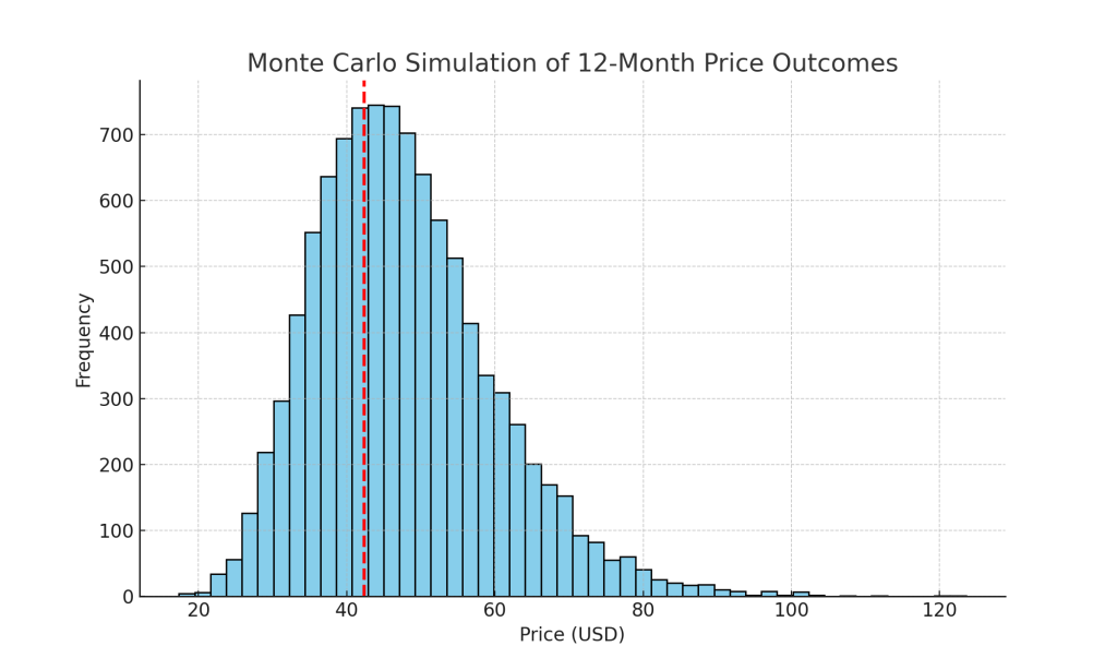 Monte Carlo simulation of BTI’s next 12-month price shows a roughly log-normal distribution. The median simulated price is around $46, and the mean is ~$47.8, about 9–13% above the current $42.37. This suggests a favorable skew, likely reflecting the stock’s positive drift (carry from dividend and undervaluation). In ~10,000 trials assuming ~12% expected return and ~25% annual volatility, about half of outcomes fall between roughly $31 and $70 (the 5th to 95th percentile range). The red dashed line marks the current price – notably, the bulk of the blue histogram lies to the right of it, indicating a high probability of price appreciation over the next year. In roughly 75% of simulations the stock’s price was higher than today’s, while ~25% of outcomes were below (downside cases often driven by worse-than-expected declines or extreme shocks). Overall, the Monte Carlo analysis reinforces a base-case expectation of moderate upside. (Median ≈ $46; Mean ≈ $48).