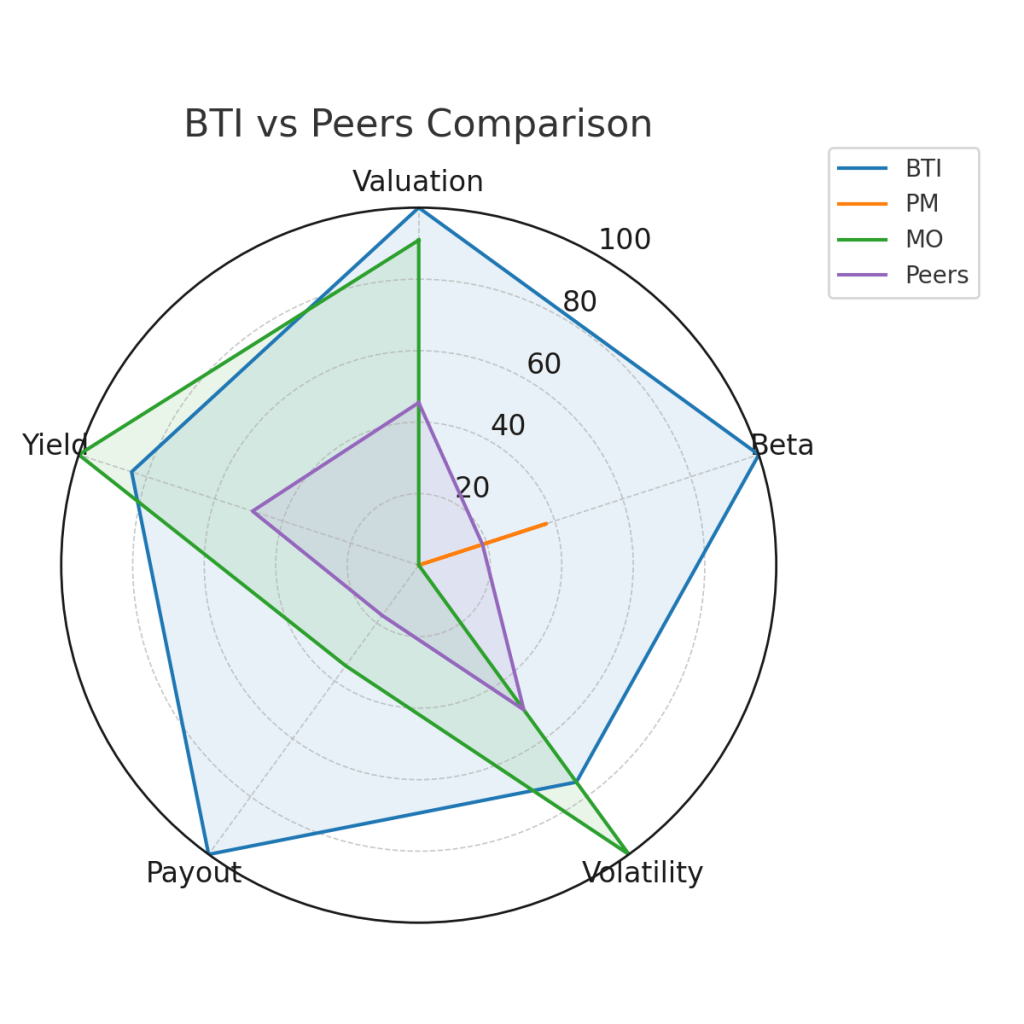 In the radar chart above, we compare BTI to two major tobacco peers – Philip Morris International (PM) and Altria (MO) – along with a peer-group average. The axes represent key factors (scaled such that outward = better). Valuation: BTI (blue) scores highest as most undervalued – it trades at a ~17% discount to fair value (British American Tobacco PLC ADR (BTI) – Morningstar), whereas MO is modestly undervalued (~14% discount (Altria Group: A High-Yielding Dividend King To Buy Now)) and PM is overvalued (~16% premium) (Philip Morris International Inc (PM) – Morningstar). BTI’s forward P/E (~8) is also far lower than PM’s (~17) or MO’s (~12). Yield: MO (green) leads with ~7.8% yield (Altria Group, Inc. (MO) Stock Price, News, Quote & History – Yahoo …), closely followed by BTI ~7.1% (BTI (British American Tobacco) Dividend Payout Ratio); PM’s yield (~3.3% after its price jump) lags considerably (Philip Morris International Inc. (PM) Stock Price, News, Quote & History). BTI and MO thus offer much higher income than the peer average (~5–6%). Dividend Safety: We use payout ratio as a proxy (lower is better). BTI again excels – its ~64% payout (BTI (British American Tobacco) Dividend Payout Ratio) is significantly more conservative than MO’s ~79% (MO (Altria Group) Dividend Payout Ratio – GuruFocus) and PM’s ~90% (Philip Morris International Inc (PM) Stock Price, Trades & News). This suggests BTI’s dividend is better covered by earnings (and cash flow), indicating a safer or more sustainable dividend. Volatility & Beta: BTI’s stock has been the least volatile and least market-sensitive. Its 5-year beta (~0.19) is far below MO’s (~0.67) or PM’s (~0.49) (Altria Group, Inc. (MO) Stock Price, News, Quote & History – Yahoo …) (Philip Morris International Inc. (PM) Stock Price, News, Quote & History). One-year price volatility tells a similar story: MO ~19%, BTI ~20%, PM ~23% (MO – Altria Group, Inc. (NYSE) – Share Price and News – Fintel) (PM – Philip Morris International Inc. (NYSE) – Share Price and News). Lower volatility and beta make BTI and MO more stable defensive plays relative to PM (which saw more share price fluctuation amid its recent rally). Overall: BTI (blue area) offers a balanced attractive profile – it is the most undervalued and among the highest-yielding, yet with the lowest risk metrics and a safe payout. Altria (green) has an even higher yield but at the cost of a higher payout ratio and higher beta (more sensitivity to market). PM (orange) is fundamentally a high-quality business with low payout ratio (~65% of adjusted earnings) and strong pricing power, but its current valuation is rich and yield comparatively low; it’s less of a bargain now after significant price appreciation. The purple shape (peer average) illustrates that BTI outperforms the group on most dimensions except perhaps absolute yield (just slightly under MO). For an income investor prioritizing dividend safety and value, BTI stands out as the best-in-class choice in this peer set.
