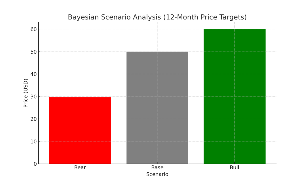 We model three subjective scenarios for BTI one year out: Bear: $30/share (≈−30% from current) – assumes a severe bear case of recessionary pressure plus adverse regulation (e.g., a U.S. menthol ban implementation), leading to multiple contraction and earnings drop. Base: $50/share (≈+18%) – our base case where BTI approaches its fair value as earnings meet expectations and the macro environment is neutral; the stock rerates closer to its intrinsic value while paying its dividend. Bull: $60/share (≈+42%) – a bullish scenario with a broad market rotation into high-yield defensives, successful new product growth, and no new regulatory shocks, resulting in significant multiple expansion (to ~12× earnings) and continued dividend reinvestment gains. We assign probabilities of 20% (Bear), 60% (Base), 20% (Bull) given current conditions. The expected value is ~$48, aligning with our Monte Carlo mean. This analysis suggests a favorable risk-reward: even the bear case, while painful, would likely be cushioned by dividends, and its probability is relatively low. The base and bull cases – which together we view as an 80% probability – imply double-digit returns. Importantly for income investors, even in the bear scenario BTI should continue its dividend (yield would rise to ~10% on the much lower price, likely attracting yield-focused buyers to provide support). In the bull case, total return could exceed 50% (price gain + yield). Thus, our Bayesian outlook skews positive, but we remain cognizant of low-probability tail risks (e.g., an unexpected interest rate spike or regulatory litigation surprise) that could produce outcomes below our bear case.