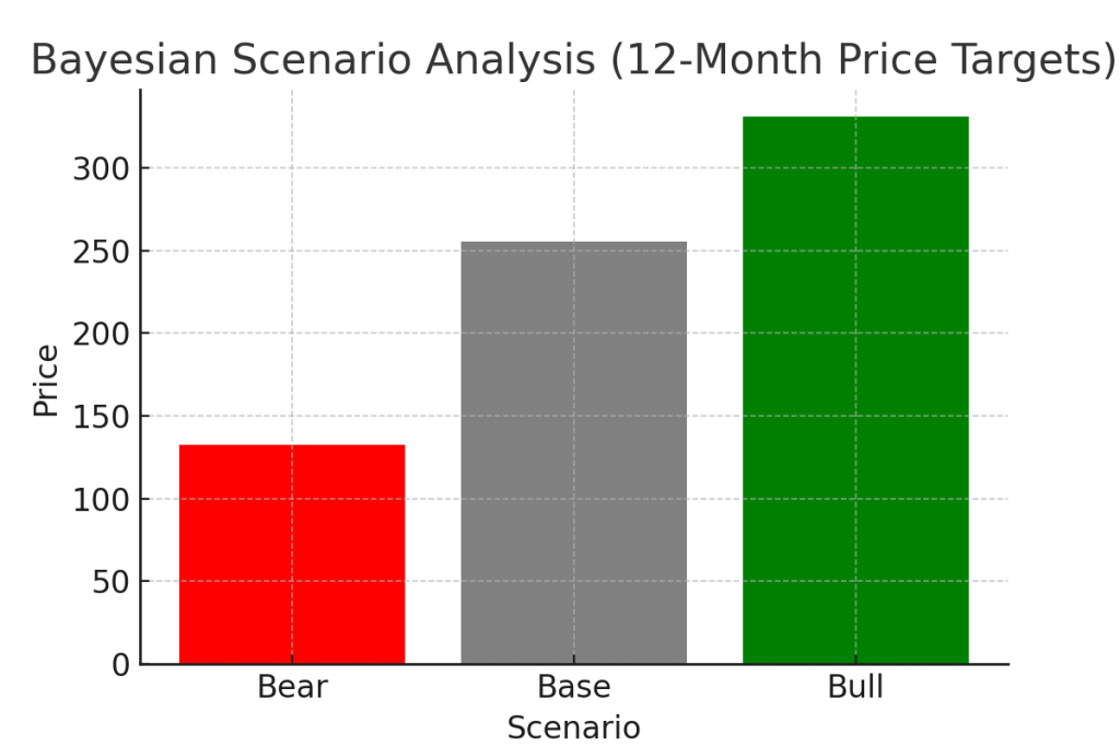 Bayesian scenario analysis for AMZN’s 12-month price target. We modeled three subjective scenarios for Amazon one year from now: a Bull case (rapid growth, strong market sentiment), a Base case (moderate performance in line with expectations), and a Bear case (weak results or market downturn). Based on current conditions, we dynamically adjust the probability weights for these scenarios. Base case ($~255$): We assign ~60% probability to the base case – in this scenario, Amazon hits consensus targets (around 10% revenue growth, mid-teens earnings growth) and the market awards it a P/E in the low-30s, yielding a price near $255 (close to the Street’s consensus $251.8 target) (Amazon (NASDAQ: AMZN) Stock Price Prediction for 2025: Where Will It Be in 1 Year – 24/7 Wall St.). Bull case ($~330$): We assign a smaller ~15% probability to the bull case. This assumes Amazon materially exceeds expectations – e.g. re-accelerating growth (perhaps AWS surprises to the upside or a new AI-driven product takes off) and/or market multiples expand. In a bull scenario, a price in the $300+ range is conceivable (the chart above shows ~$331, +75% from current), which aligns with some aggressive DCF valuations (SimplyWall.st estimates ~$339 as an upper-range intrinsic value) (Is There An Opportunity With Amazon.com, Inc.’s (NASDAQ:AMZN …). However, given macro and competitive headwinds, we cap this probability. Bear case ($~132$): We assign ~25% probability to the bear case – a scenario where Amazon disappoints (e.g. recession hits consumer spending, AWS growth stalls, or a negative regulatory shock). In this case, the stock could drop to the low-$130s (–30%), roughly consistent with a 0.7× multiple on the current price (as shown by the red bar). A ~$130 price would value Amazon at around 20–22× forward earnings, which might occur if growth prospects look bleak. Probability-weighted outcome: Using these weights, our expected 12-month price is around $235–$240 (slightly below the simple average of scenarios, reflecting the tilted probabilities). This expected value is a bit more conservative than the Monte Carlo mean ($213 with symmetric assumptions) and the Street’s ~$252 target, incorporating our view of non-trivial downside risk. It still represents a healthy upside from $189. In summary, while the base-case outcome is strong, one should account for the meaningful chance of a bearish outcome. Our Bayesian model suggests a favorable expected return, but not without risk – underscoring our Buy rating with the caveat of potential volatility. We will update these probabilities as new data comes (e.g. quarterly earnings, macro shifts); for now, the base case remains the anchor scenario.