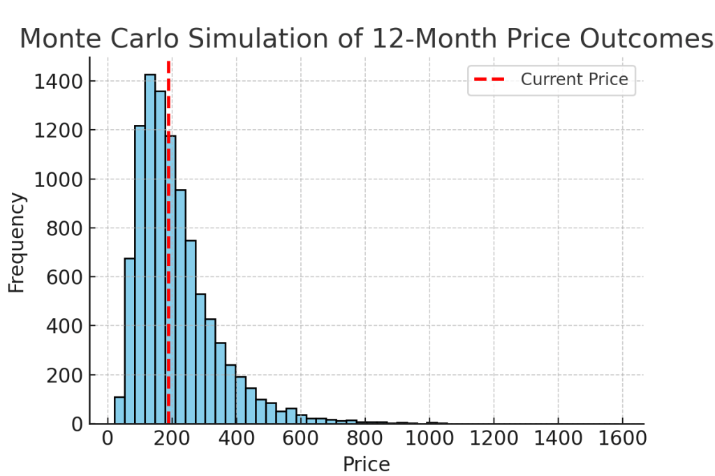 Monte Carlo simulation of 12-month price outcomes for AMZN. Using a geometric Brownian motion model (assuming ~12% expected annual return and ~50% volatility), we ran 10,000 simulated price paths for the next year. The distribution of outcomes (histogram above) is wide, reflecting Amazon’s high volatility. The median simulated price after 1 year is ~$183 (slightly below the current ~$189), while the mean outcome is higher at ~$213, due to the right-skewed distribution (a few very high outcomes raise the average). There is roughly a 50% probability that AMZN’s price will be less than it is today in 12 months (median < current price), but also a significant probability of large gains. In fact, ~25% of the simulations resulted in a price above ~$255 (roughly the base-case target), while about 5% of outcomes even exceeded $450 (extreme bullish scenarios). Conversely, ~25% of simulations gave a price below ~$140. This analysis implies that while the most likely outcomes center around a modest rise to the low $200s, investors should be prepared for a wide range of possibilities. The current pricing already factors in substantial uncertainty. Notably, the simulated mean of $213 suggests an expected return of ~+13%, which is in line with our bullish tilt – but the high variance means downside scenarios (including significant declines) cannot be ignored. Investors should ensure their risk tolerance accommodates this volatility.