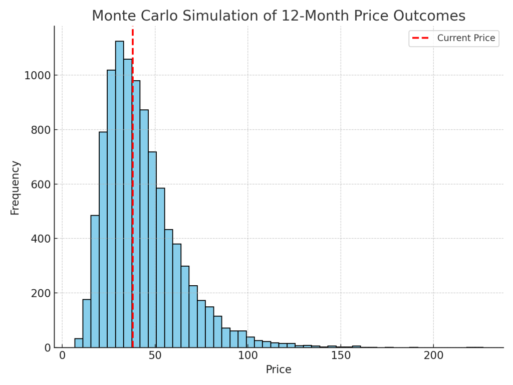 Figure: 12-Month Monte Carlo Price Distribution. We performed a Monte Carlo simulation modeling Kyndryl’s stock price over the next year. The simulation (10,000 trials) assumes a starting price of ~$38, an expected annual return of 12%, and high annual volatility around 45%. The resulting distribution of possible prices in 12 months is shown above. Summary: The median simulated price is approximately $38 (near the current price), and the mean price is about $43, indicating a slight skew to the upside. There is a wide spread of outcomes, reflecting uncertainty: roughly 90% of the simulated outcomes fall between ~$18 (bearish tail) and ~$81 (bullish tail). The red dashed line in the chart marks the current price – about half of the simulations end above this line and half below. This suggests an almost balanced outlook with a tilt upward (since the mean > current price). In practical terms, the Monte Carlo analysis implies that if our assumptions hold, there is about a 50% probability Kyndryl’s stock will be at least modestly higher in a year, and a ~25% chance it could be significantly higher (>$50). Conversely, there is also a ~25% chance the stock could decline to the mid-$20s or lower. This stochastic analysis aligns with our scenario-based targets (see below), reinforcing that while upside potential is substantial, downside risks are not negligible. Investors should thus expect a volatile ride, but with a base-case outcome that is positive.