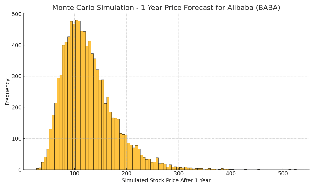 Figure: Simulated 1-year price paths for BABA under a Monte Carlo model of returns. Paths illustrate a wide distribution of outcomes reflecting current volatility (assuming ~35–40% volatility and modest drift). Median outcome suggests low-to-mid single digit gains, but the 5th/95th percentile range spans roughly –30% to +60%.