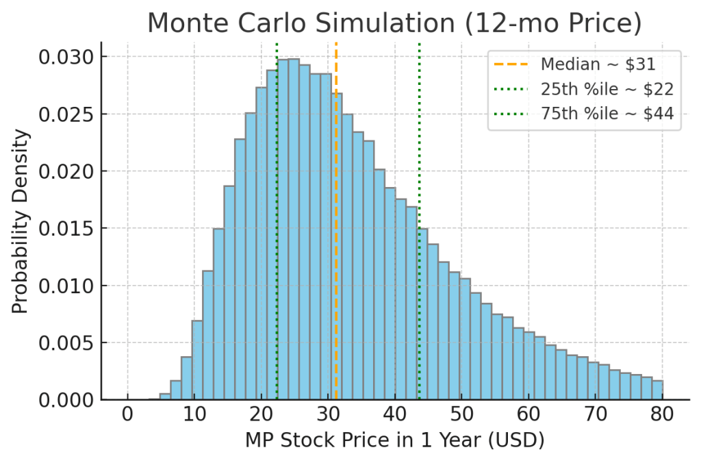 Technical chart: Monte Carlo simulation of 12-month MP stock price outcomes. The distribution (based on volatility ~50% annually) is skewed and wide, reflecting MP’s high volatility. There is roughly an equal chance of significant upside or downside – the median simulated price is ~$31 (orange line), while there’s ~25% probability of falling below ~$22 (left green line) and ~25% probability of exceeding ~$44 (right green line) within one year. (Note: This simulation assumes no net drift; actual outcomes will depend on fundamental news.)**