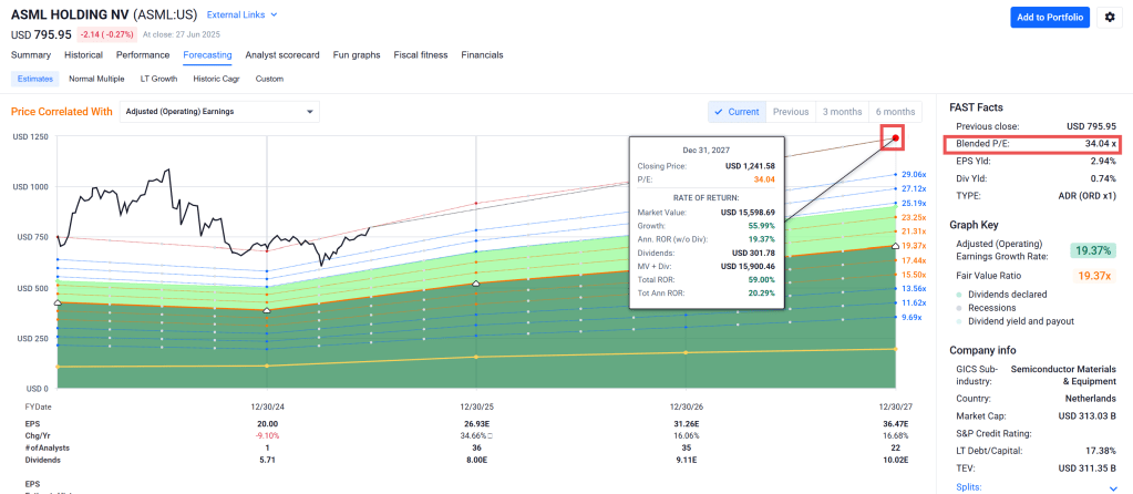 It’s important to stress that DCF valuations are sensitive to inputs. For a high-quality, long-duration growth company like ASML, small changes in WACC or terminal growth can swing the output. To sanity-check, we also look at implied multiples: $840 corresponds to ~32× TTM EPS and ~26× 2025E EPS – which is within the range of what long-term investors might pay for ~15% sustainable growth (PEG ~1.7). If we demanded a higher return (say a 10% discount rate), the fair value would drop, implying the stock could be modestly overvalued under a stricter hurdle. Conversely, if one believes ASML can grow 15% for longer, the fair value pops above $900.