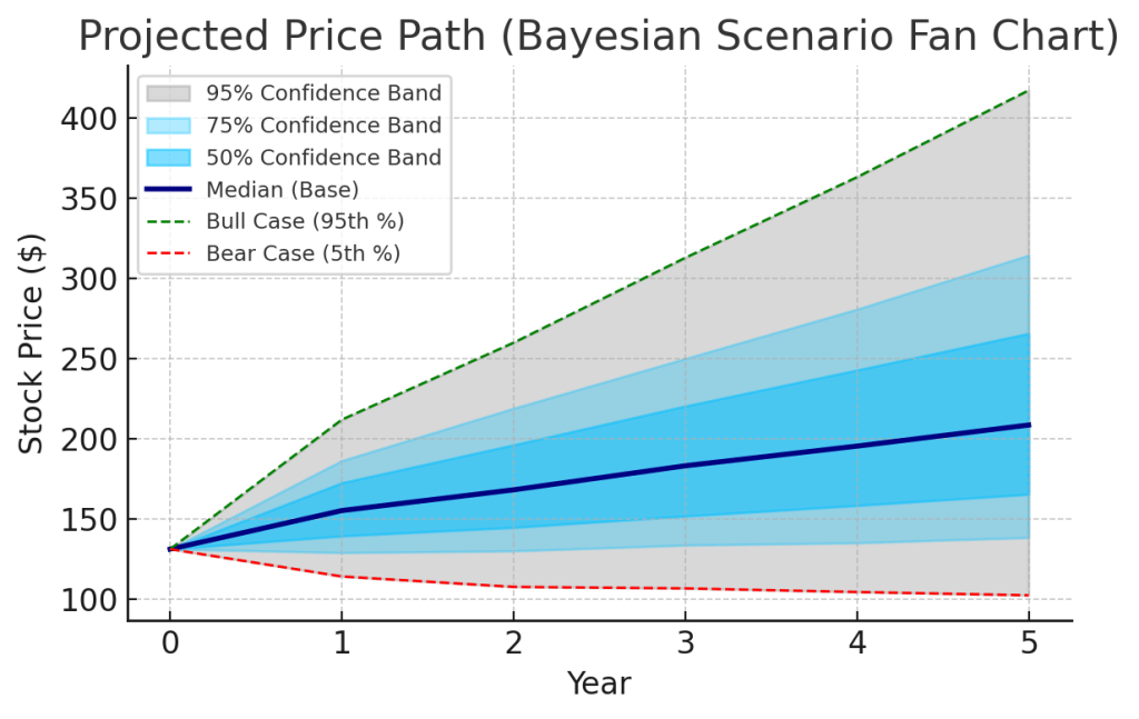 Bayesian scenario “fan chart” for PepsiCo’s stock price over the next 5 years. The blue line shows the median (base-case) projection, reaching around $208 by year 5. Shaded regions represent confidence bands: the dark blue band is the 50% confidence interval (middle 50% of outcomes), the lighter blue plus dark covers 75%, and the gray region spans 95% of possible outcomes. The green dashed line illustrates an optimistic bull-case trajectory (95th percentile) and the red dashed line a pessimistic bear-case (5th percentile). This model incorporates macro-conditioned priors: e.g., bull scenarios assume benign inflation and strong emerging-market growth, while bear scenarios assume persistent margin pressures and weak consumer spending.