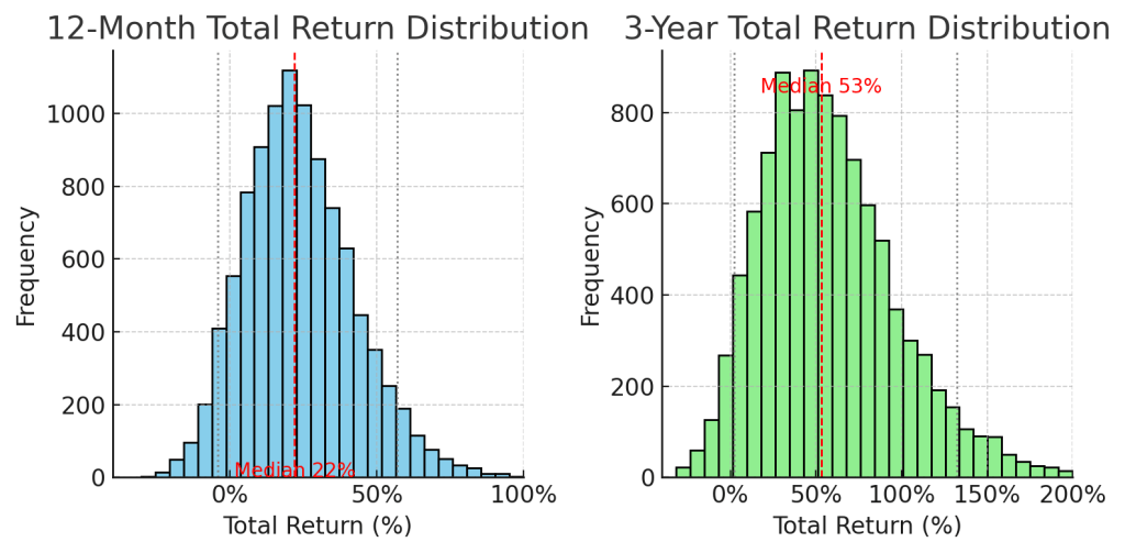 Simulated distribution of PepsiCo’s 12-month and 3-year total returns (10,000 trials). The blue histogram (left) shows the 1-year return distribution, centered around a median ~+22% (red dashed line) with a modest left-tail risk (~5% chance of a slight loss, worst-case ≈ –30%). The green histogram (right) shows the 3-year total return distribution, with a median ~+53% (~15% annualized). The 3-year outcomes are wider in range but overwhelmingly positive (95% of simulations > +2% total return). These simulations incorporate historical volatility (~15.7%/yr) and correlations for PEP, assuming partial mean reversion to fair value in year 1 and more normalized growth thereafter.