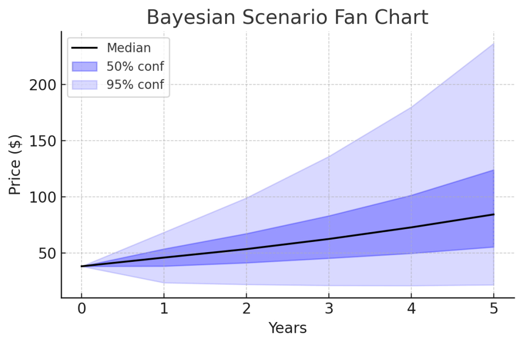 - Macro/Regime Factors: Current macro-regimes – elevated global LNG demand, secular underinvestment in oil supply, and a weaker USD – support energy service activity. A potential risk in 2–3 years is a recession or policy shift: for instance, a sharp global slowdown or stringent climate policies could dampen fossil fuel development, hitting Baker’s orders. However, Baker Hughes is positioning for the energy transition (e.g. investments in geothermal, carbon capture equipment), which may buffer longer-term downside. U.S. political shifts (post-2024 election) bear watching: a more drilling-friendly U.S. policy stance would favor Baker’s OFS segment, whereas aggressive renewable subsidies could gradually temper oilfield growth (though likely not fully material within 3 years). Given these cross-currents, our Bayesian scenario model projects a Base case median path where BKR steadily appreciates into the mid-$50s by 2028, with Bull and Bear branches illustrating the range of outcomes. The fan chart below shows the median (black line) and 50%/75%/95% confidence bands – even the lower band (95% bear case) trends slightly upward over 5 years, underscoring limited long-run downside if one holds through interim volatility. 5-year fan chart: Bull (upper bound) vs. Bear (lower bound) scenarios. Median outlook (black) sees gradual gains; 50% and 95% confidence intervals (shaded) widen over time.