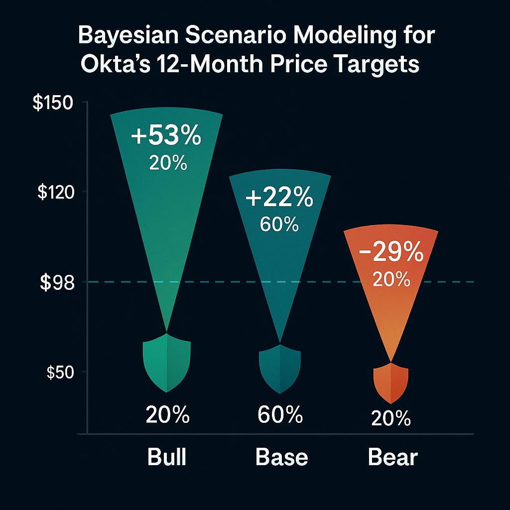 Figure 7: *Bayesian scenario modeling for Okta’s 12-month price targets under Bull, Base, and Bear cases, with subjective macro-conditioned probabilities. In our framework, we assign 20% probability to a Bull scenario (strong macro recovery, ~15%+ rev growth, accelerating cloud spending), 60% to a Base scenario (steady execution, ~10% growth as guided, no recession), and 20% to a Bear scenario (macro slowdown or execution stumble, ~5% growth). The chart above illustrates projected stock prices for each scenario: ~$150 in Bull (+~53% from current), ~$120 in Base (+~22%), and ~$70 in Bear (–29%). The bars are annotated with the implied return vs current (white text) and the probability weight. The horizontal dashed line is the current price ($98). This suggests a weighted expected price ~$116 (slightly above current market consensus). The scenario analysis shows Okta’s upside could be quite substantial if things go right, but there is also a downside risk in a bearish outcome. Investors should consider these probability-weighted scenarios in light of their own macro outlook.