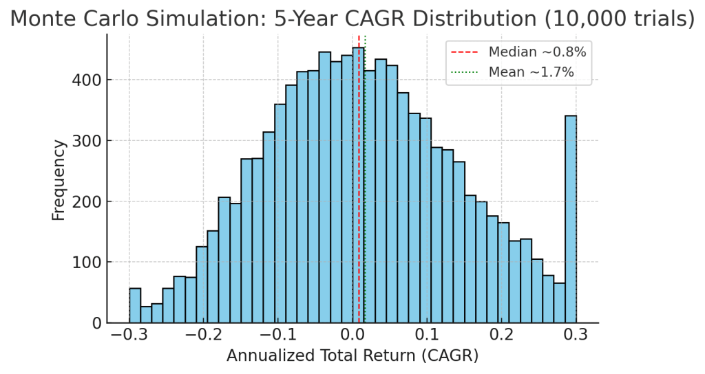 5-Year Monte Carlo simulation of Vistra’s total returns (CAGR). 10,000 trials assume ~10% expected EPS growth, initial overvaluation, and ~30% annual volatility. The distribution is wide, reflecting Vistra’s high uncertainty. The median simulated outcome (red line) is only ~0.8%/year CAGR over 5 years, and there is a substantial left-tail (about a 1 in 3 chance of negative returns). The mean (green line) is slightly higher (~1.7%/yr), pulled up by some extremely positive outliers. There’s roughly a 10% probability of losing ≥15% annually (far left bins) and a 10% chance of gaining ≥20% annually (far right).