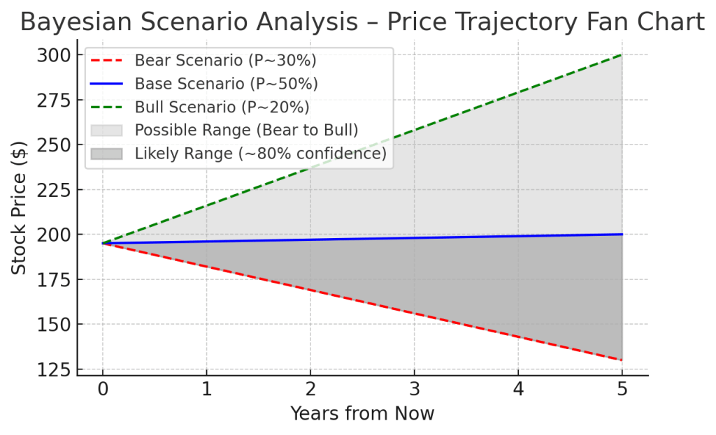 Projected price paths under Bear (red, 30% prob), Base (blue, 50% prob), and Bull (green, 20% prob) scenarios over the next 5 years. The shaded region indicates the range of possible outcomes (light gray = full range from bear to bull, darker gray = “likely” range covering ~80% confidence between bear and base scenarios). In the Bear case, the stock declines toward ~$130 as valuation multiples compress and growth disappoints. In the Base case, the stock stays roughly flat in the high-$190s for a couple of years then modestly rises to ~$200 by year 5 as earnings catch up. In the Bull case, the stock climbs to ~$300 by 2030, driven by superior earnings and sustained high valuation. The fan chart shows most of the probability (dark band) is between the bear and base paths – i.e. outcomes from modest decline to modest growth – with the bull case an upper outlier.