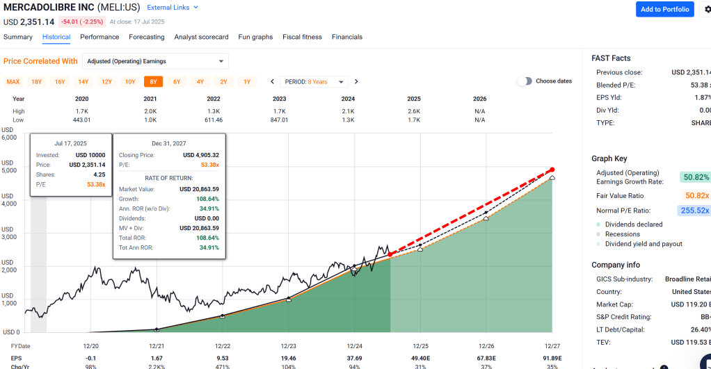 - Seeking Alpha – “MercadoLibre: Massive Growth Ahead” (2025) – Notes 38.6× forward P/E vs 29% EPS growth, supporting bullish outlook.