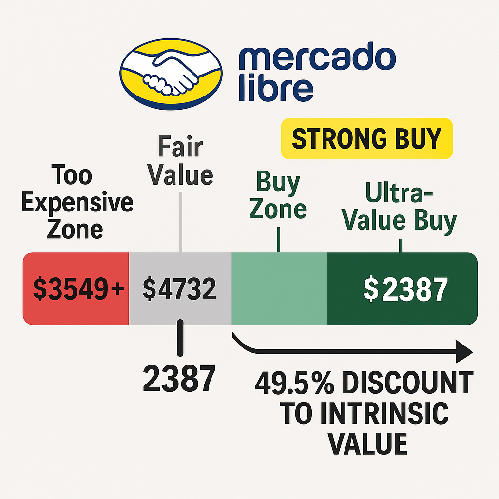 Final Recommendation: We recommend long-term investors add or build positions in MercadoLibre at current levels (~$2387). The stock is in our “Ultra Value” buy zone, meaning the discount to fair value is large and rare. For those not yet in, initiating a position now is warranted, and we would scale in further on any dips (e.g. technical pullbacks to ~$2000 or lower). If you already hold MELI, we advise staying overweight given the high conviction – the stock’s risk-adjusted outlook remains among the best in our coverage universe. That said, position sizing should respect one’s risk tolerance; while our framework allows up to ~20% allocation for a name of this caliber, a more moderate ~10% weighting can still deliver meaningful portfolio impact without undue concentration. We will continue to monitor MELI closely for any thesis changes (watching the risk flags discussed). Barring a severe unforeseen negative, we see MercadoLibre as a core high-conviction holding capable of delivering market-beating returns over the next year and beyond.