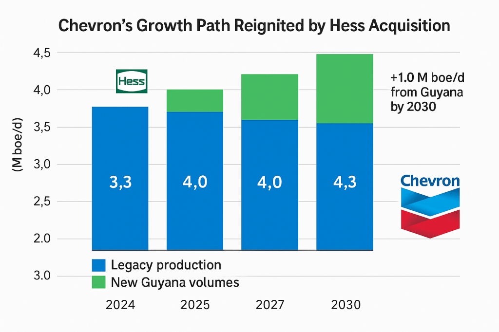 The Hess close fixes Chevron’s biggest strategic hole: organic reserve replacement had slipped to 45 % in 2024, the lowest in a decade. Guyana alone lifts proved reserves ~+120 % and puts CVX back on a growth trajectory that otherwise relied almost entirely on the maturing Permian. Management now guides 4.3 million boe/d by 2030—roughly +1 million versus the stand-alone plan—while capex per incremental barrel falls thanks to Stabroek’s sub-$30 breakeven. (Reuters)