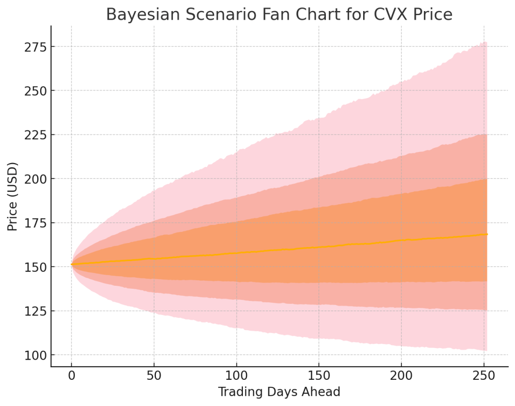 Chevron now wields the rare combination of super-major scale, fortress balance-sheet, and an under-appreciated long-duration growth engine. The Hess deal compresses its break-even, lengthens its reserve life, and de-risks the dividend—all while the stock trades at a discount to peers. Vulcan-mk5’s holistic read—DCF, peer metrics, Monte-Carlo, Bayesian macro overlay—points to a favourable asymmetry of reward to risk.