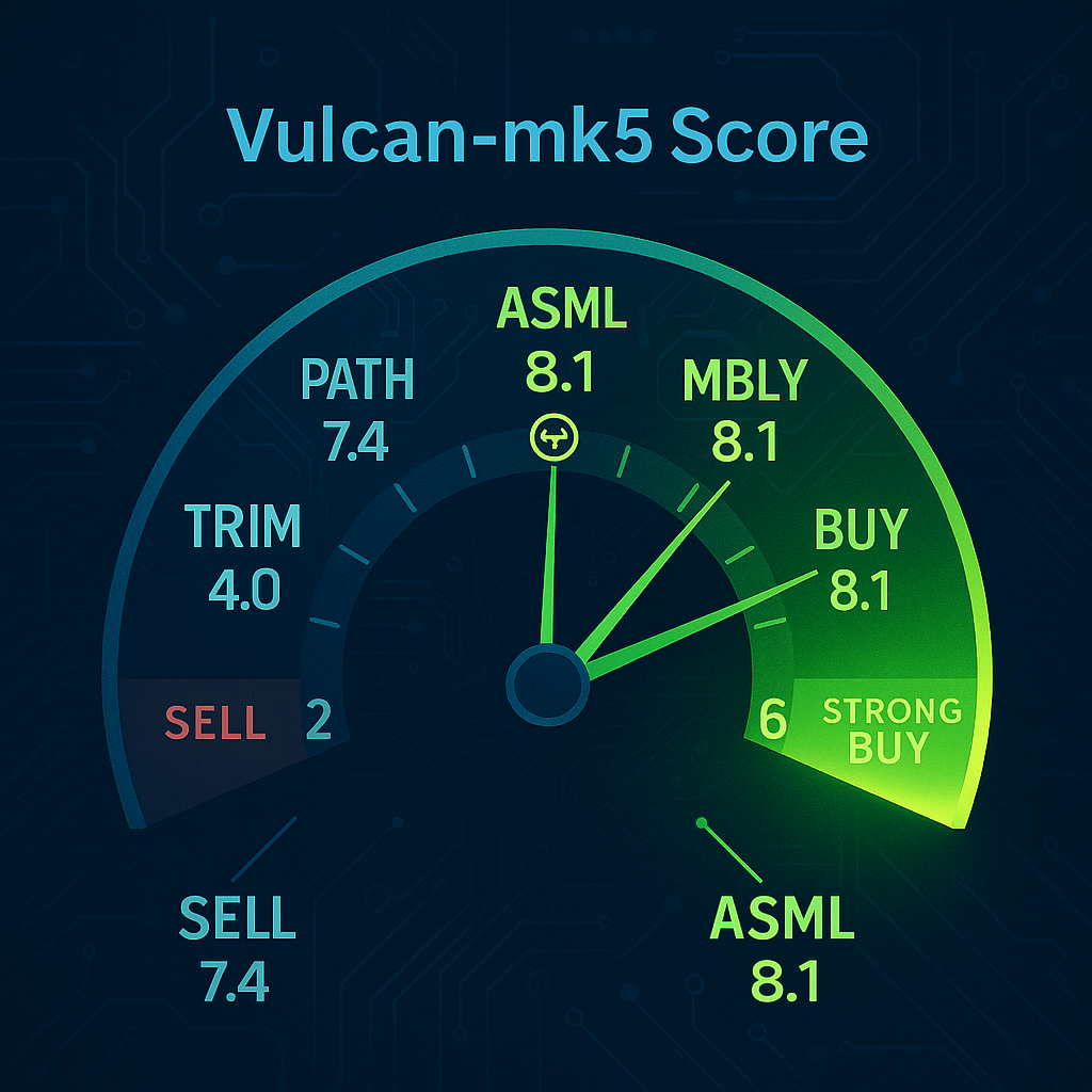 | Rank | Ticker | Company | Sector / AI Role | M-Cap ($ B)* | LT EPS CAGR | Current Price (18 Jul) | Fair Value† | Discount / Premium | Buy-Guidance‡ | Vulcan-mk5 Score§ | Model Call |