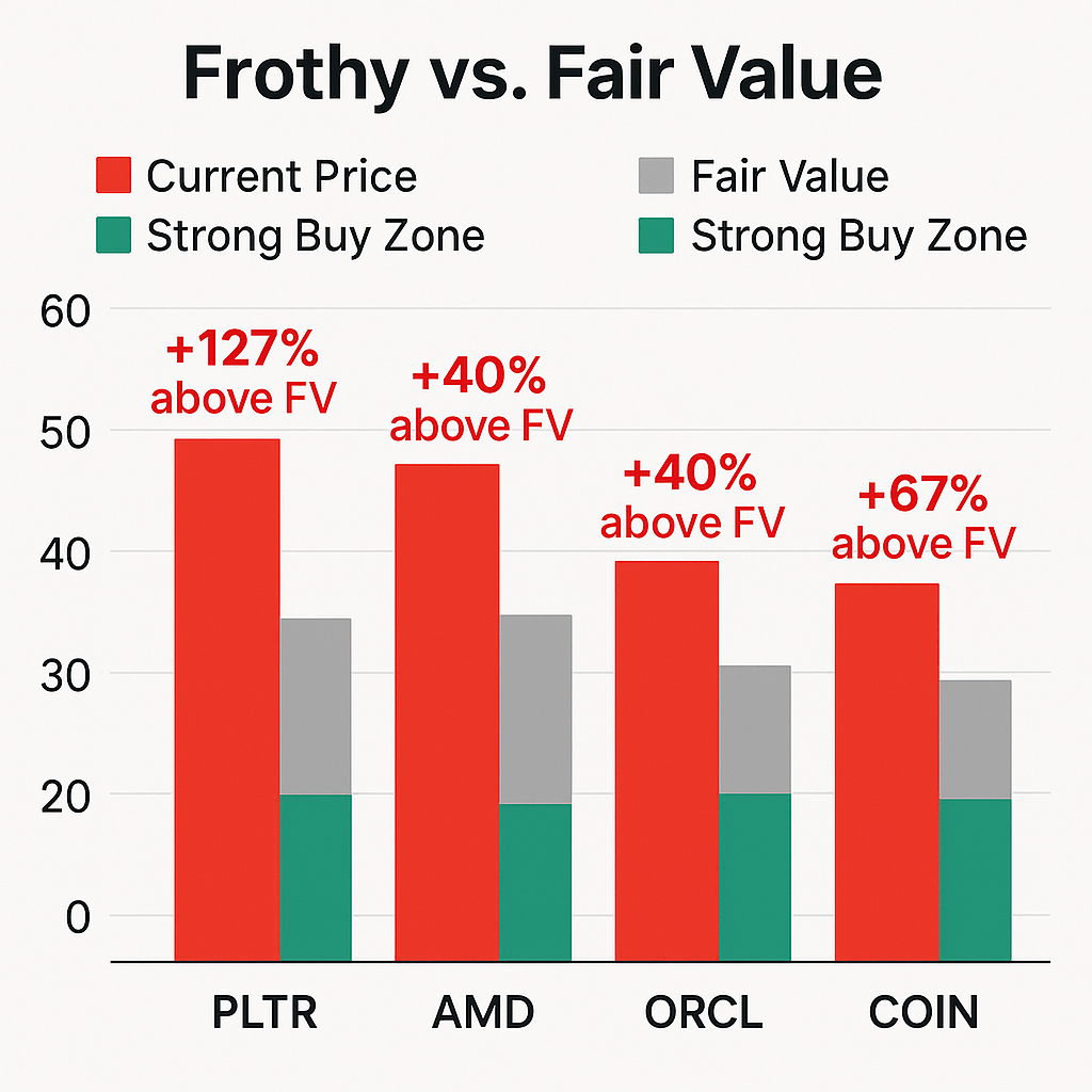As shown, fundamentals and forecasts do not fully support the astronomical YTD gains – a classic hallmark of a frothy market. Vulcan-mk5’s quantamental verdict: Palantir and Oracle earn “Trim” ratings, AMD a cautious “Hold”, and Coinbase (if covered) likely a Hold/Speculative. None are in “Strong Buy” range at current prices. This doesn’t guarantee they’ll drop – momentum can defy fundamentals longer than we expect – but it does imply asymmetric risk (more downside risk than upside reward) unless business results surprise dramatically on the upside.