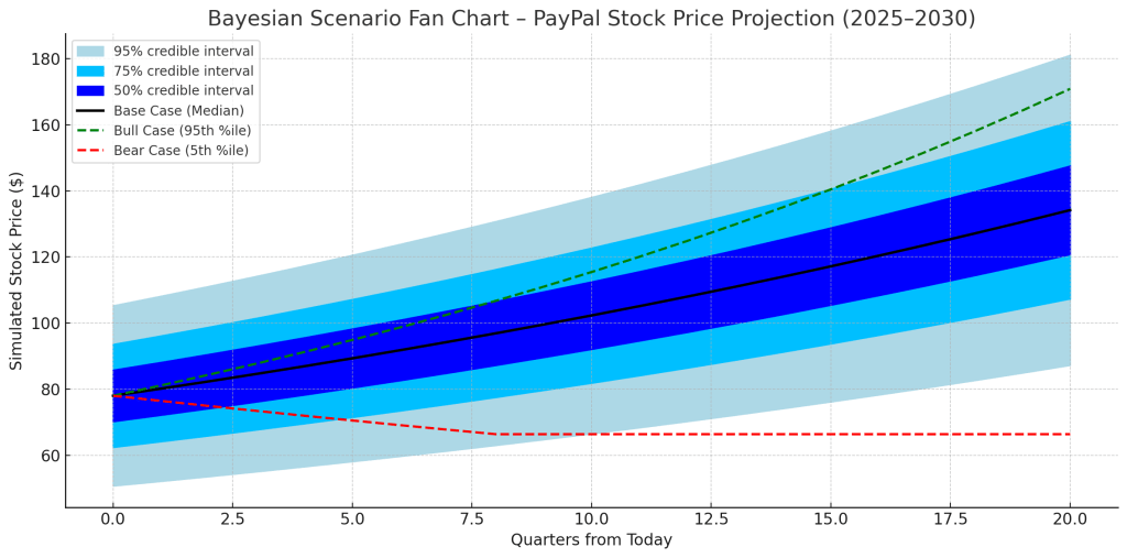 Bayesian scenario fan chart for PayPal (5-year projection, quarterly intervals). The solid black line is the median (base-case) forecast, bounded by 50% confidence (dark blue band), 75% (medium blue), and 95% (light blue) credible intervals. Green dashed line = bullish scenario (95th percentile), Red dashed line = bearish scenario (5th percentile). Our Bayesian model branches into Bull, Base, and Bear cases conditioned on the macro regime: Currently, with a recessionary bias, the base case (median) assumes subdued growth in 2025 followed by a recovery. Under this base scenario, PayPal’s stock appreciates gradually toward ~$130 by 2029 – essentially converging to our DCF fair value as fundamentals improve. The bull case (top green trajectory) envisions stronger outcomes – perhaps a soft landing economically and successful new product ramps – yielding a share price ~$165+ by 5 years. The bear case (bottom red) reflects a severe downturn or competitive erosion, which could see the stock drift to ~$50 over the next couple of years before stabilizing. These are low-probability tail scenarios; more than half of simulated paths (50% band) cluster between roughly $80 and $140 beyond 2026. Notably, the fan chart skews upward over time, indicating that time is on the side of fundamentally sound but undervalued stocks like PYPL – given even middling execution, the valuation gap is projected to close. For reference, Street analysts currently foresee a base-case ~$72–75 by end of 2025 (in line with our model’s near-term midpoint), but significantly higher recovery by 2026 (toward $90) if macro improves. Our fan chart encompasses these outcomes and underscores a core point: downside appears contained (blue bands flatten in bear case), whereas upside grows over time if PayPal resumes growth.