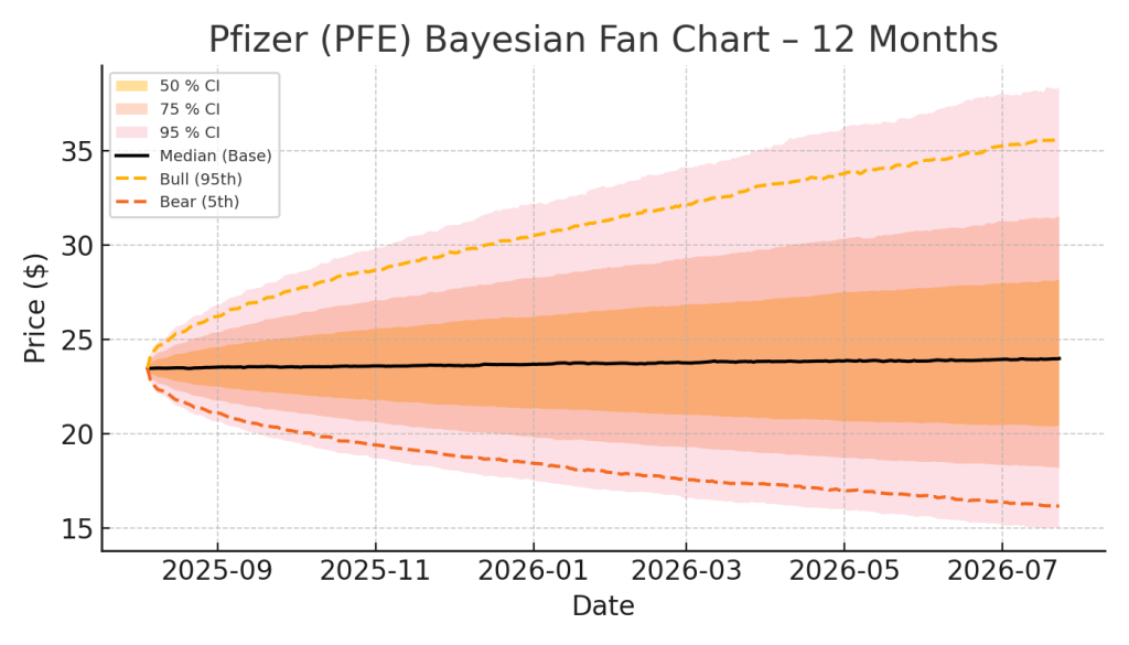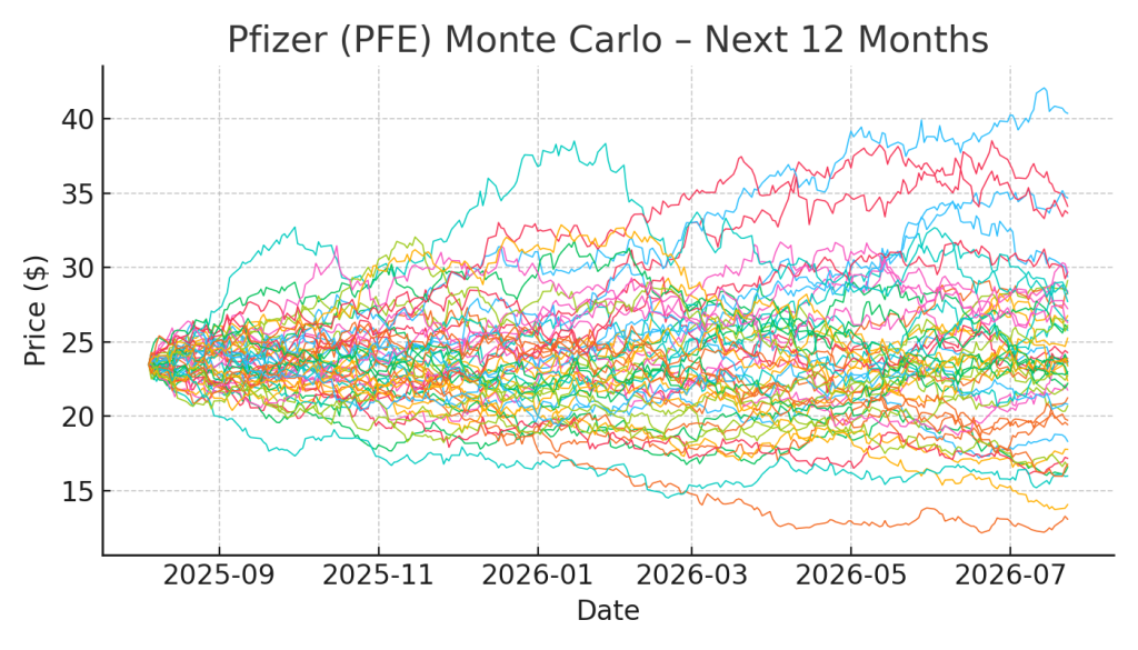 Multiple-re-rating potential: At 7.9 × forward P/E, Pfizer trades at a 45 % discount to the big-pharma basket (14–16 ×). Even a partial closing of that gap—supported by cost savings and new product launches—yields a mid-$29 share price in our Monte-Carlo median path.