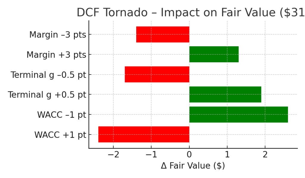 The tornado chart shows fair value is most sensitive to ±100 bps in WACC (± $2.5/sh) and ± 50 bps in terminal growth (± $1.7). Margins move the needle, but less sharply than cost of capital—supporting the emphasis on expense control.
