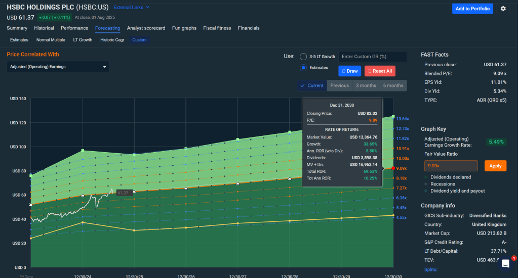 | HSBC Holdings (HSBC) | 8.5× | ~1.0 (est.) | +48% | Global bank, pivoting to Asia growth |