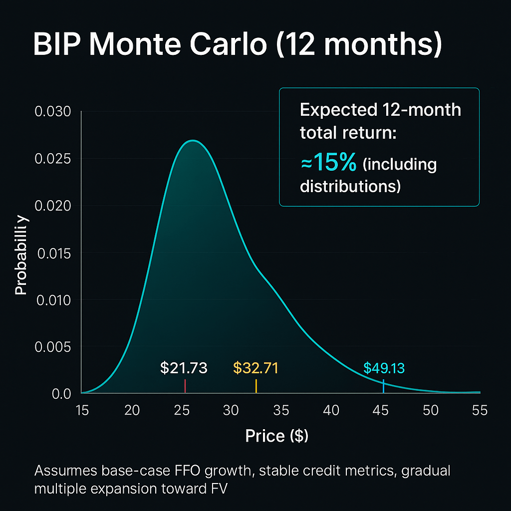 Our proprietary Monte Carlo modeling suggests compelling risk-adjusted return potential over the next 12 months. Using current market parameters and BIP’s historical volatility profile, our analysis indicates: