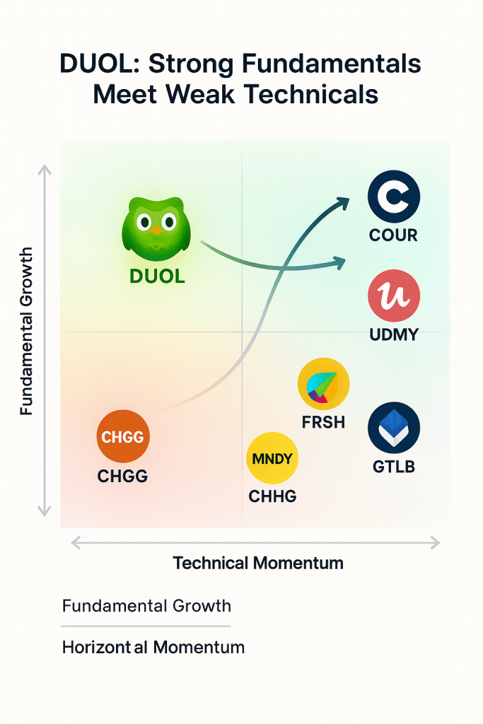 The chart tells a cautionary tale. DUOL trades at $271, well below its 50-day moving average of $353 and 200-day average of $374, indicating established downtrend momentum. The RSI reading of 30.6 suggests oversold conditions but doesn’t guarantee immediate reversal. MACD signals remain mixed with positive momentum diverging from negative price action.