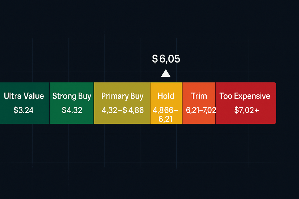 | Primary Buy Zone | $4.32-$4.86 | 10-20% below fair value |