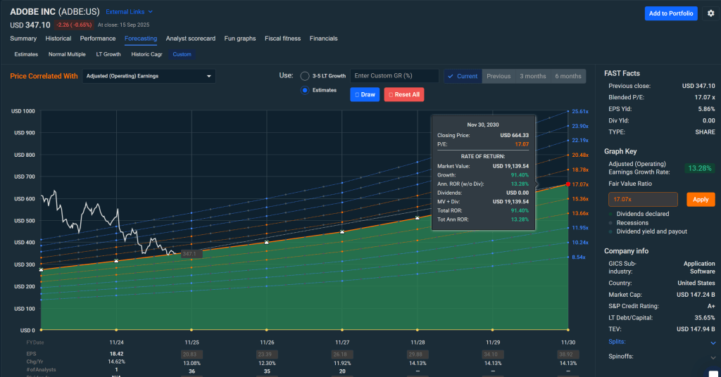 Multiple professional analyses suggest Adobe trades at a significant discount to intrinsic value. Morningstar maintains a $560 fair value estimate, implying 60%+ upside. CFRA reduced its target to $425 but maintains a Buy rating, noting the stock trades at just 15-17x forward earnings compared to quality software peers at 21-33x multiples.
