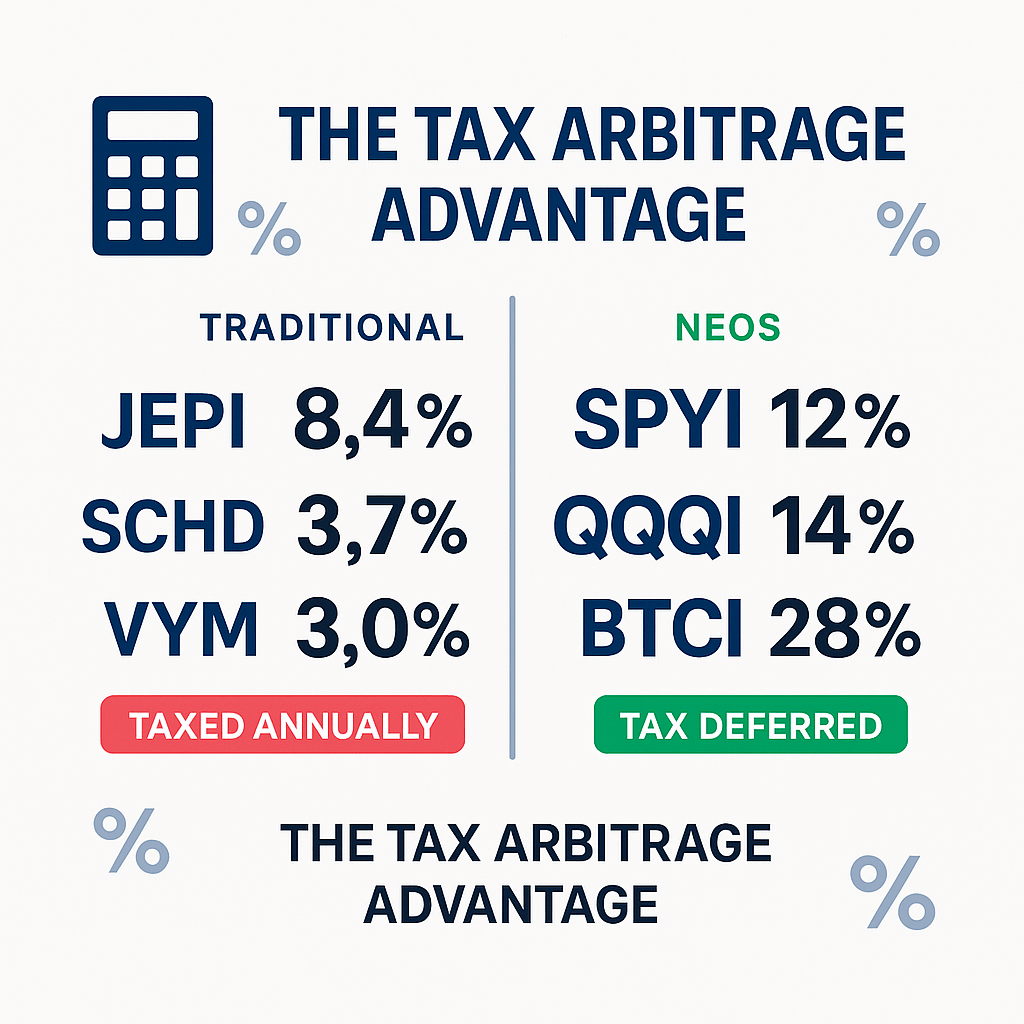 When market volatility becomes your paycheck, traditional dividend math breaks down completely. The NEOS S&P 500 High Income ETF (SPYI), Nasdaq-100 High Income ETF (QQQI), and Bitcoin High Income ETF (BTCI) are rewriting income investing by delivering yields of 12%, 14%, and 28% respectively—with most distributions classified as tax-deferred return of capital. While traditional dividend funds like SCHD yield 3.7% and covered-call veteran JEPI delivers 8.4%, these option-driven strategies are extracting double-digit income from the market’s natural volatility. From our research data, SPYI has maintained NAV growth despite paying massive distributions, proving this isn’t capital destruction disguised as yield. The tax efficiency alone creates a compelling arbitrage: receiving 12% annually with minimal current-year tax liability versus JEPI’s 8% fully-taxable income. I’m positioning this trio as a core income allocation, with specific buy zones that capitalize on the volatility-yield relationship driving these strategies.