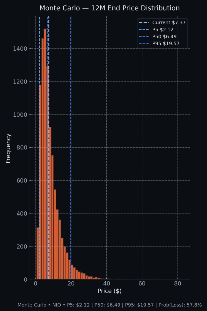Our 12-month Monte Carlo analysis using 10,000 simulations reveals the statistical reality behind NIO’s volatility. With 67% annualized volatility anchored to the current $7.37 price, the distribution shows meaningful downside risk.
