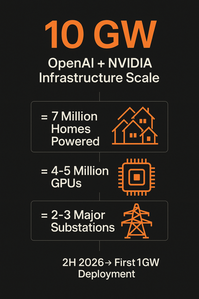 NVIDIA’s landmark $100 billion investment in OpenAI, announced Monday, represents far more than a typical tech partnership—it’s a complete reimagining of AI infrastructure at unprecedented scale. The deal calls for deploying at least 10 gigawatts of NVIDIA-powered AI data centers, beginning with the first gigawatt in the second half of 2026. To put this in perspective, 10 gigawatts could power roughly 7 million homes continuously.