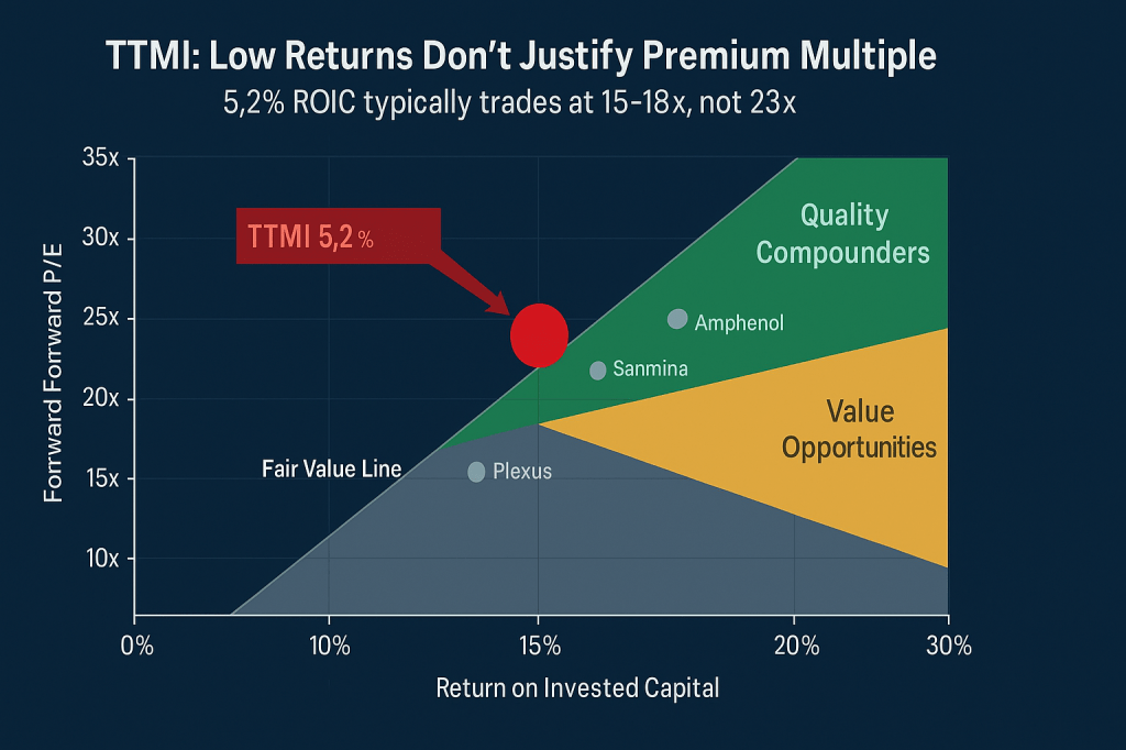 Cross-check with multiples: TTMI trades at 23.2x forward earnings versus peer group averages around 18-22x. Sanmina trades at 25x with similar revenue but better returns (11% ROIC). Plexus trades at 25.1x with 80/100 quality score versus TTMI’s 60/100. The current multiple isn’t absurd relative to peers, but peers may also be overvalued. More importantly, TTMI’s below-average returns don’t justify peer-group multiples.