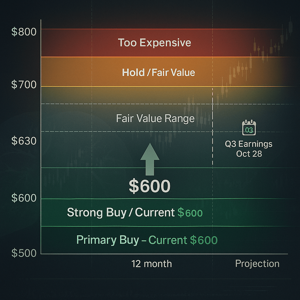 Current Price: $600.00 | Fair Value Range: $690-$720 | Margin of Safety: 18% | Next Catalyst: Q3 Earnings Oct 28, 2025