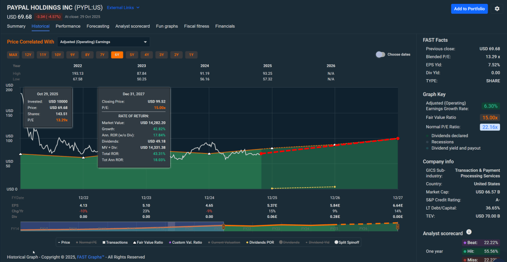 Third, category bias. The market treats PayPal as a fintech stock, applying the volatile multiples and skepticism that plague the sector after 2021-2022’s speculative excesses. But PayPal’s financial profile—stable revenues, high margins, strong FCF, dividend initiation—resembles a mature technology infrastructure company more than a speculative fintech. Visa and Mastercard trade at 25-30x earnings despite slower growth because investors recognize their cash-generative durability. PayPal at 13.3x forward earnings reflects a 50% discount for executing the same playbook.