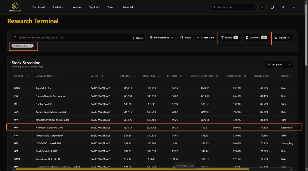 The GNG Research terminal calculates fair value at $120.65, with a “Reasonable Buy” rating. That’s 5.6% upside from current levels even before accounting for further gold appreciation.