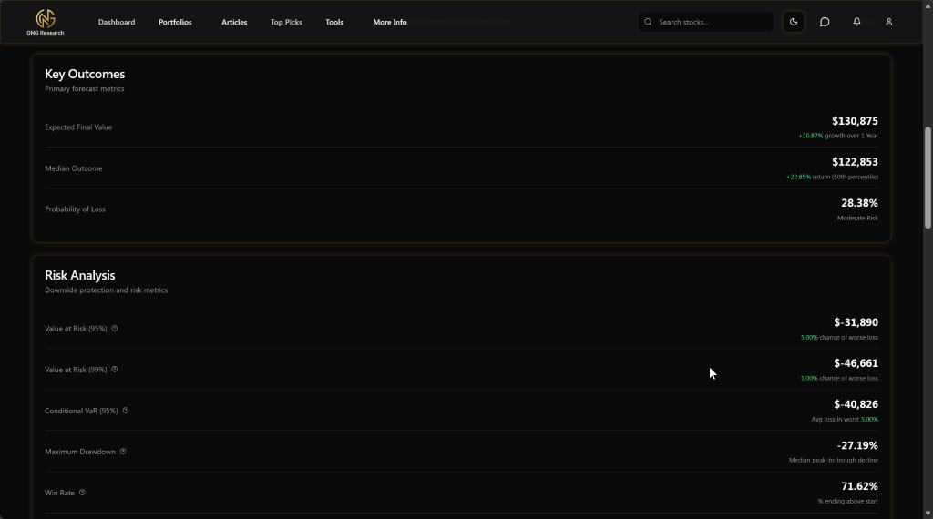 The 10-year lookback, which includes the 2015-2020 gold doldrums, shows more modest expectations. Median outcome of 23% returns with a 28% probability of loss. Expected final value: $130,875.