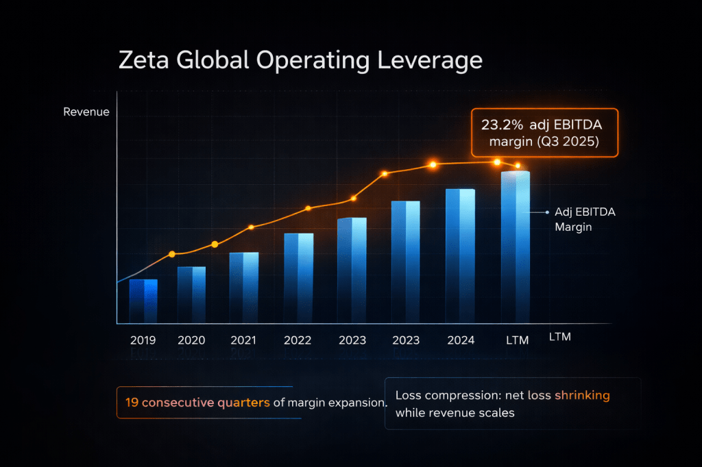 Here is the number that matters more than any partnership announcement: Zeta’s adjusted EBITDA margin hit 23.2% in Q3 2025. That extends a 19-quarter streak of margin expansion. The company is still not GAAP profitable, reporting a small net loss last quarter, but the gap between operating profits and accounting profits is closing fast.