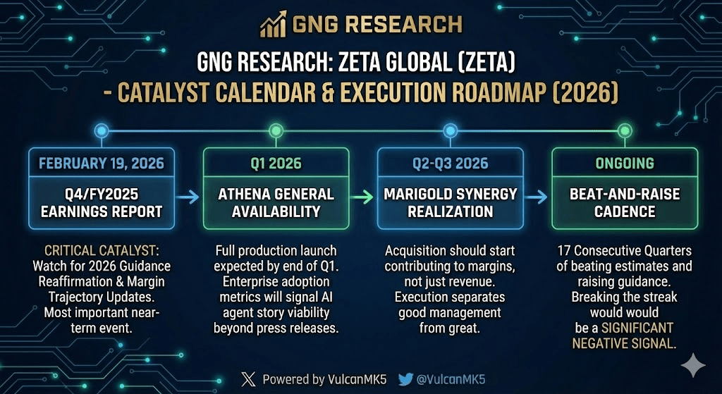 Ongoing: Beat-and-raise cadence. Zeta has delivered 17 consecutive quarters of beating estimates and raising guidance. Breaking that streak would be a significant negative signal.