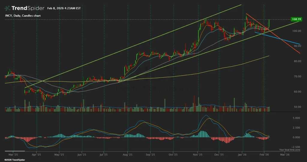 The broader technical picture remains intact. INCY has been trading in a rising channel since mid-2025, with higher lows forming a clear support structure. The 200-day moving average at $92.31 provides the major trend defense. RSI will likely reset from the mid-60s toward the mid-50s on this pullback, removing overbought concerns.