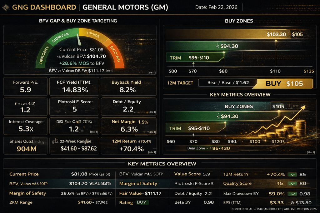 GM’s sum-of-the-parts valuation, built from the ground up with probability-weighted scenarios, produces a base fair value of $104.70 per share. At a recent price near $81, that is a 29% discount to intrinsic value. The Vulcan database independently calculates fair value at $111.17, which is even more generous.