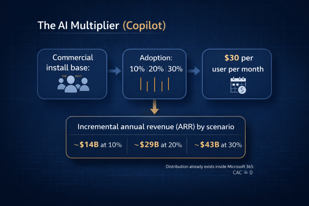 Copilot, Microsoft’s AI assistant layered into Office 365, costs $30 per user per month. If even 20% of the 400 million commercial install base adopts it, that’s roughly $29 billion in incremental annual revenue, and it flows through at software margins because the distribution channel (Office 365) already sits on every corporate desktop in the world. The customer acquisition cost is effectively zero.