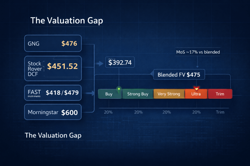 Our Blended Fair Value weights these sources by methodology and recency: 30% GNG, 30% Stock Rover, 25% FAST Graphs normal PE, 15% Morningstar.