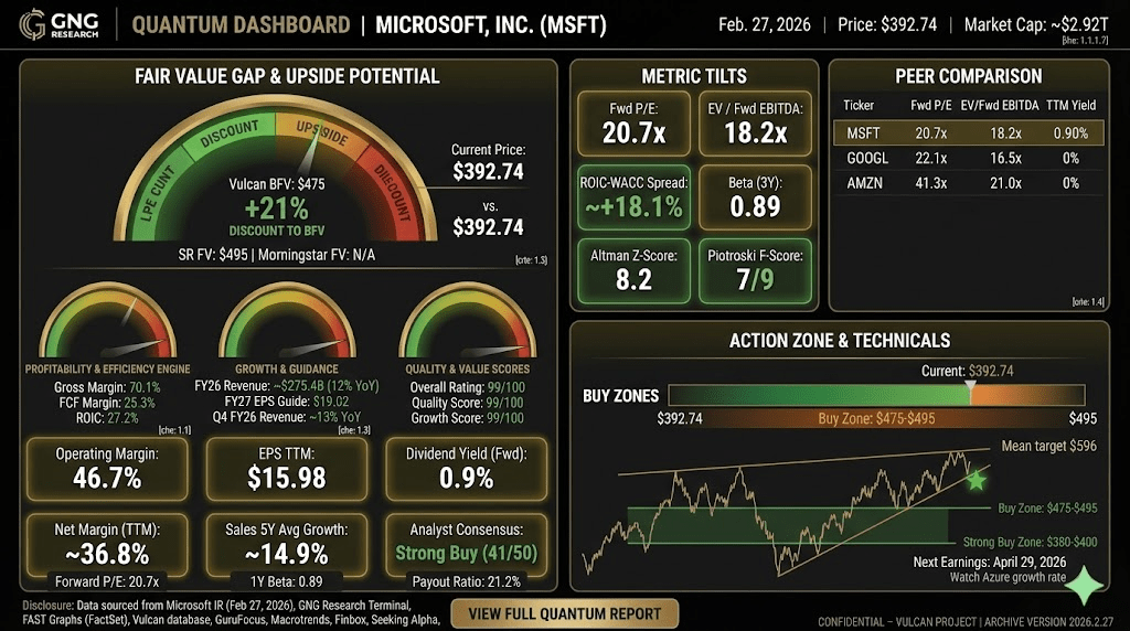 Microsoft is the kind of stock that doesn’t generate headlines until it’s already moved 30% higher. At $392, you’re buying a AAA-rated compounder with 17% earnings growth, a 99th-percentile quality profile, and a 17% discount to blended fair value.