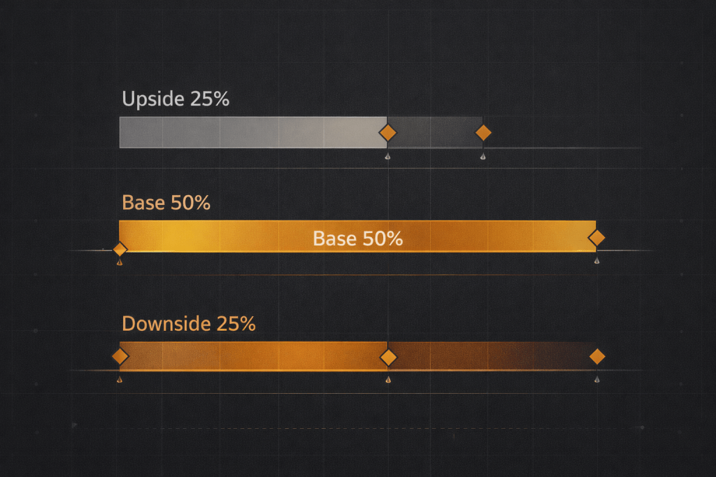 Downside (25% probability): $300 to $355. Cycle cracks, HBM mix disappoints, post-earnings derate sends the stock back to the strong buy zone. In this scenario, I add rather than sell.