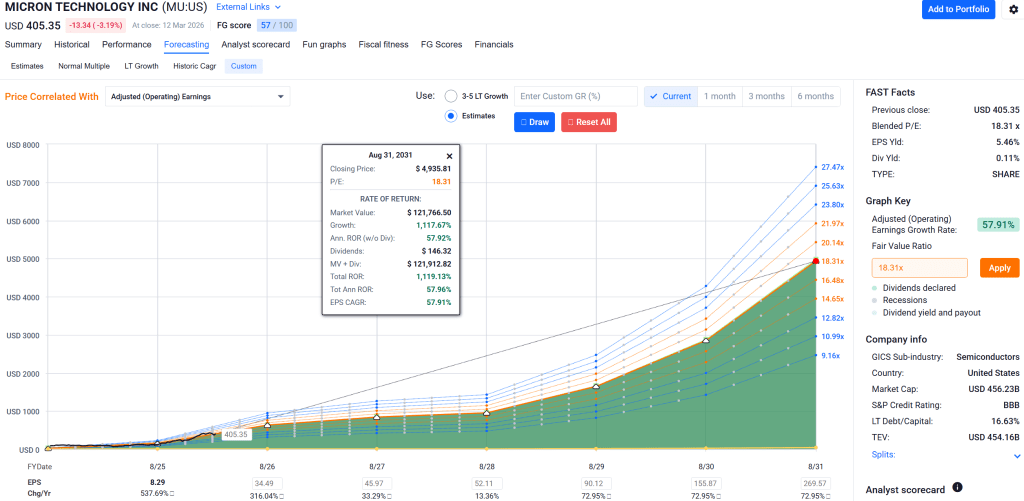 - FastGraphs, Forecasting view for Micron Technology (MU), accessed March 2026.