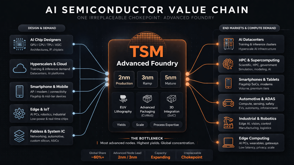 Think of TSMC as the only commercial-grade forge on the planet capable of working with a specific metal. (NVDA) designs the blueprint. (AMD) draws up competing plans. (AAPL) sketches its own custom pieces. But every single one of them walks into the same building in Taiwan to get their designs turned into physical silicon.