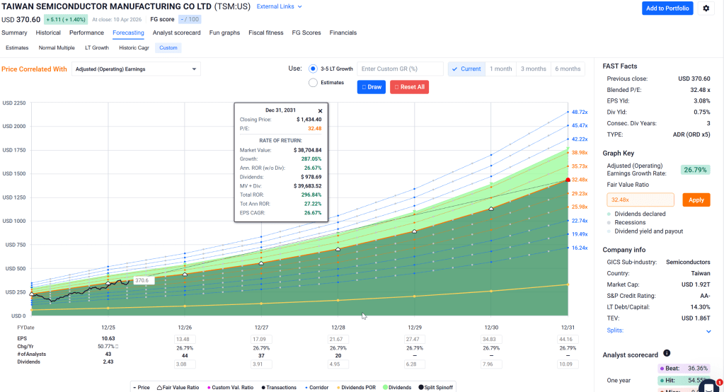 Here’s where I have to be honest about the setup. TSMC is not a bargain-bin buy. At $370, the stock trades at roughly 24.7x forward earnings with a PEG of about 1.2. In my valuation framework, the blended fair value comes in around $391, which gives a margin of safety of approximately 5.4%. That’s enough to justify a buy, but it isn’t the kind of discount that makes you aggressive. FastGraphs, with its FactSet data, shows a Blended P/E of 32.48 and Total Annualized Rate of Return of 27%. This is incredible growth that has legs for years to come.